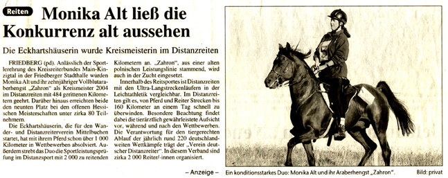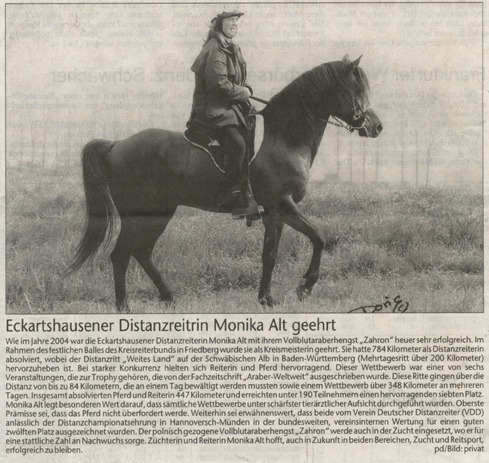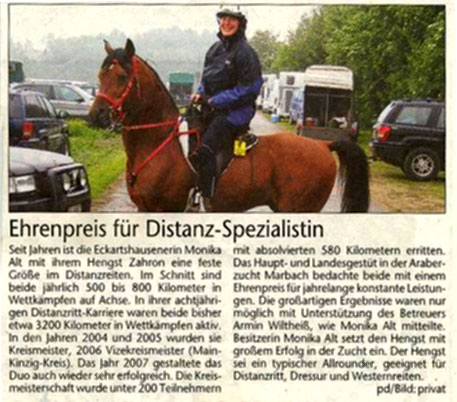Der 1994 geborene braune Zahron (Zarif x Emirah von Sawih Ibn Wisznu) wurde 1997 vom VZAP mit der Note 5 eingetragen. Er lief in seiner Distanzkarriere bereits über 3.100 Kilometer in der Wertung und absolvierte seine HLP über Distanzen. 2006 erreichte er einen achtbaren elften Platz in der AWW Trophy. Achtbar vor allem deswegen, weil seiner Reiterin Monika Alt, Büdingen auf einen Start verzichtete, um dem Organisatorenteam zu helfen. Dabei gingen Zahron wertvolle Wertungs-Kilometer verloren. 2007 holte das Team Zahron/Alt das Versäumte nach und erreichten die Top Ten der AWW Trophy. “Aber das Team wäre nicht vollständig ohne meinen hervorragenden Trosser Armin Wiltheiß”, betont Monika Alt. “Ohne seine großartige Unterstützung wären wir auf den Strecken ziemlich aufgeschmissen.”