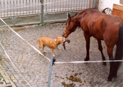 Neben den Distanzritten kümmert Zahron sich aber auch um seine Stuten und am liebsten spielt er mit seiner Freundin Gina, eine American-Staffordshire-Hündin.